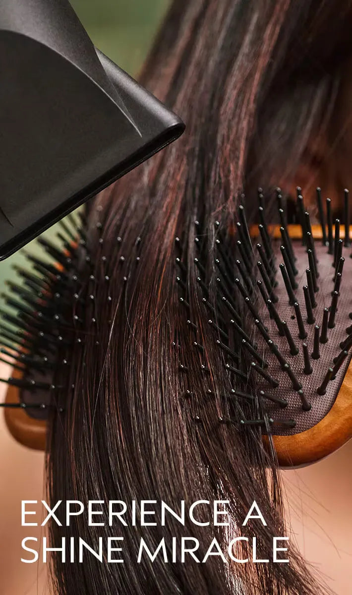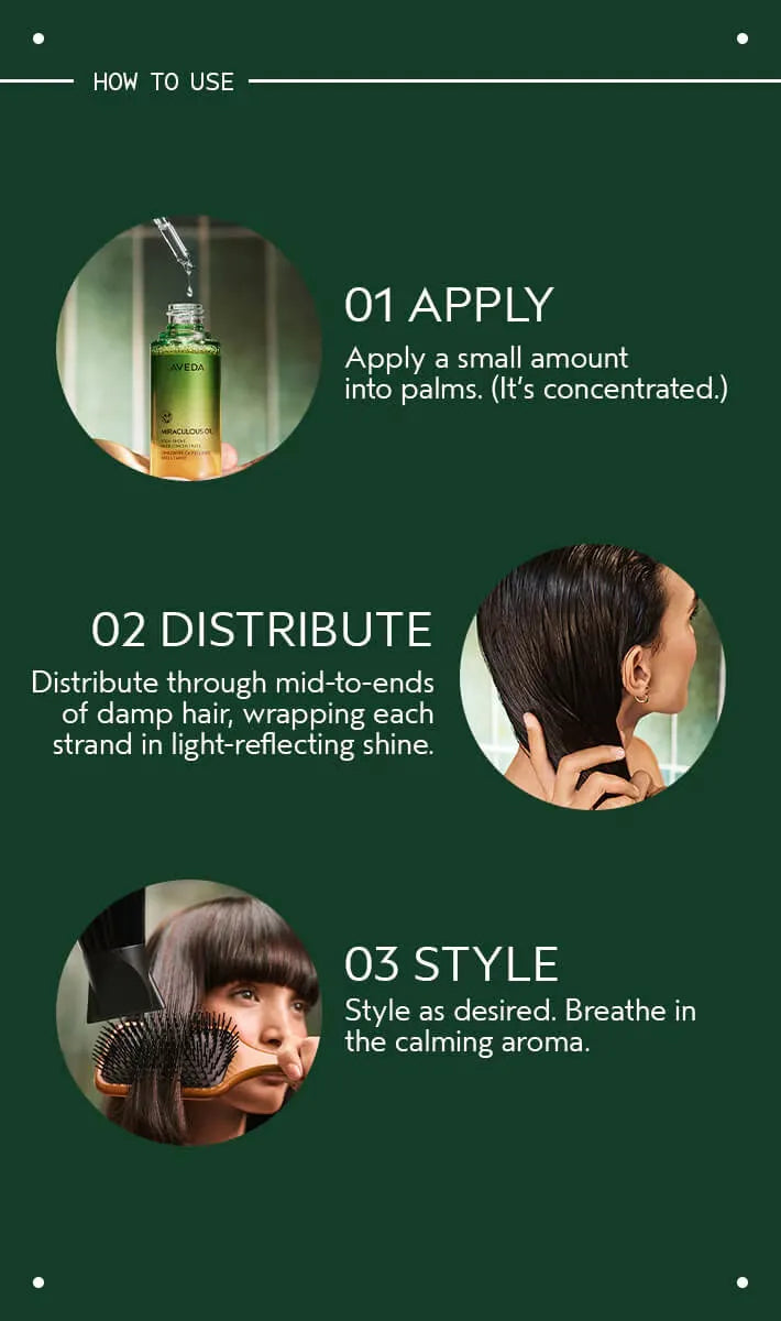 As this shiny hair oil is concentrated, start small. Dispense the hair oil into palms and distribute through mid-lengths to end on damp hair. Then blow dry. This hair oil can also be used on dried hair to help smooth flyaways.